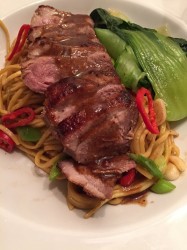 Divide the noodles between two bowls, add sliced duck on top and lay the steamed pak choi to the side of the bowl.